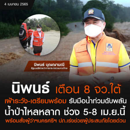 นิพนธ์ เตือน 8 จว.ใต้ เฝ้าระวัง-เตรียมพร้อม รับมือน้ำท่วมฉับพลัน น้ำป่าไหลหลาก ช่วง 5-8 เม.ย.นี้ พร้อมสั่งผู้ว่าฯนครศรีฯ ปภ.เร่งช่วยผู้ประสบภัยโดยด่วน