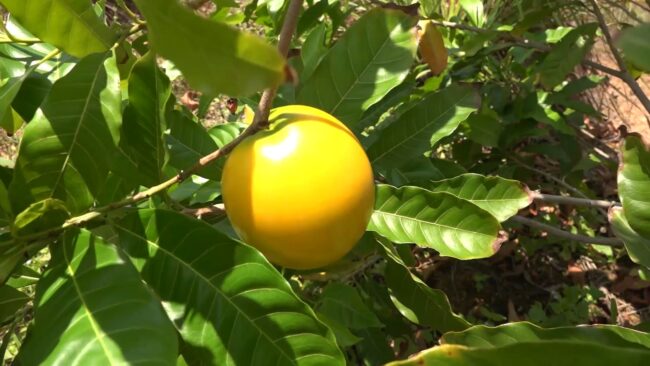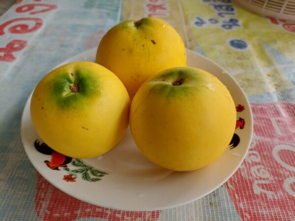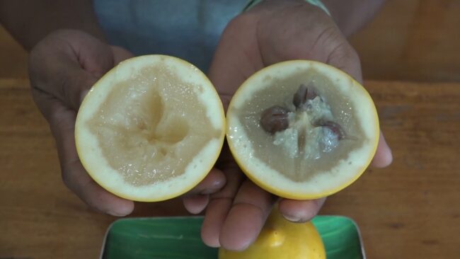 ส่วนผลก็จะออกในลักษณะสีเหลืองทอง บางท่านเรียกว่าผลไม้ทองคำ เพราะว่าเหลืองเหมือนทองคำ เวลาสุกจะเป็นสีเหลือง เวลาเราปลูกมันจะเป็นผลทั้งปี ตั้งแต่ ดอก ลูกเล็ก แล้วก็สุก สามารถเก็บเกี่ยวได้เรื่อยๆ ในส่วนของรสชาดก็จะผ่ากลางแล้วก็ตักเหมือนเยลลี่ มีกลิ่นหอม บางคนบอกกลิ่นหอมเหมือนมะม่วง หอมเหมือนลูกตาลโตนด กลิ่นเราทานเข้าไปจะหอมติดคอ นิ่ม ถ้าเรานำไปแช่ในตู้เย็น รสชาดก็จะเพิ่มความหวาน ความหอมเพิ่มขึ้น นั้นเป็นผลไม้ที่สามารถปลูกและรับประทานได้ง่าย