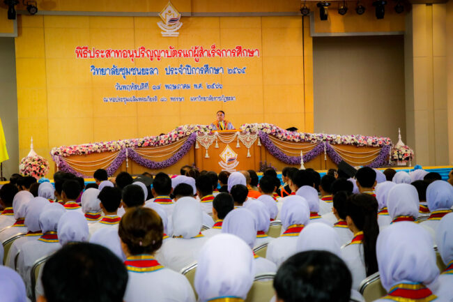 วันนี้ (18 พฤษภาคม 2566) ณ หอประชุมมหาวิทยาลัยราชภัฏยะลา อำเภอเมืองยะลา จังหวัดยะลา พลเอกกัมปนาท รุดดิษฐ์ องคมนตรี เป็นประธานในพิธีประสาทอนุปริญญาบัตรผู้สำเร็จการศึกษา ของวิทยาลัยชุมชนยะลา ประจำปีการศึกษา 2565 ซึ่งมีผู้สำเร็จการศึกษาของวิทยาลัยชุมชนจังหวัดยะลา จำนวน 346 คนจำแนกเป็นสาขาวิชาการจัดการ สาขาวิชาการปกครองท้องถิ่น สาขาวิชาการพัฒนาชุมชน สาขาวิชาการศึกษาปฐมวัย สาขาวิชาคอมพิวเตอร์ธุรกิจ สาขาวิชาเทคโนโลยีการเกษตร สาขาวิชาสาธารณสุขชุมชน โดยมีสภามหาวิทยาลัยชุมชน คณาจารย์ของวิทยาลัย เลขาธิการศูนย์อำนวยการบริหารจังหวัดชายแดนภาคใต้ รองผู้ว่าราชการจังหวัดยะลา และหัวหน้าส่วนราชการในพื้นที่ร่วมในพิธี