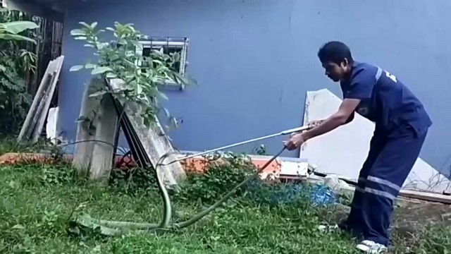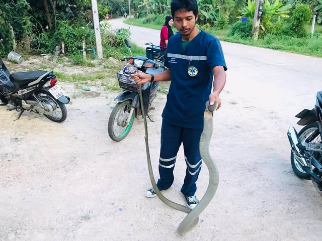 วันนี้ 4 มกราคม 2567 ขณะที่นายทวีศักดิ์ บุญเศษ เจ้าหน้าที่ทีมอสรพิษภาคใต้ พร้อมด้วยนายวิชชุกร ช้างอินทร์ และกู้ชีพ อบต.สะท้อน กำลังออกปฏิบัติหน้าที่อยู่ในพื้นที่ ก็ได้รับแจ้งจากนายกามาน หะหวัง อายุ 45 ปี อยู่บ้านเลขที่ 13/1 หมู่ 6 ต.ท่าประดู่ อ.นาทวี จ.สงขลา ว่ามีงูจงอางเลื้อยมานอนขดตัวอยู่ที่บริเวณข้างบ้าน