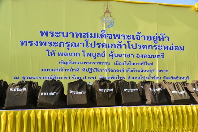 จันทบุรี-พระบาทสมเด็จพระเจ้าอยู่หัว ทรงพระกรุณาโปรดเกล้าฯ ให้องคมนตรีเชิญสิ่งของพระราชทาน มอบแก่เจ้าหน้าที่ ที่ปฏิบัติภารกิจกองกำลังชายแดนจันทบุรีและตราด เนื่องในโอกาสปีใหม่สร้างขวัญกำลังใจ