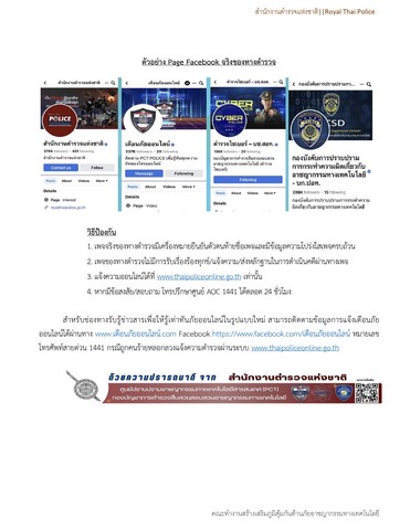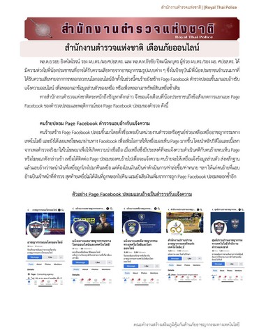 ทางสำนักงานตำรวจแห่งชาติตระหนักถึงปัญหาดังกล่าว จึงขอแจ้งเตือนพี่น้องประชาชนถึงข้อสังเกตการแยกแยะ Page Facebook ของตำรวจปลอมและพฤติการณ์ของ Page Facebook ปลอมของตำรวจ ดังนี้