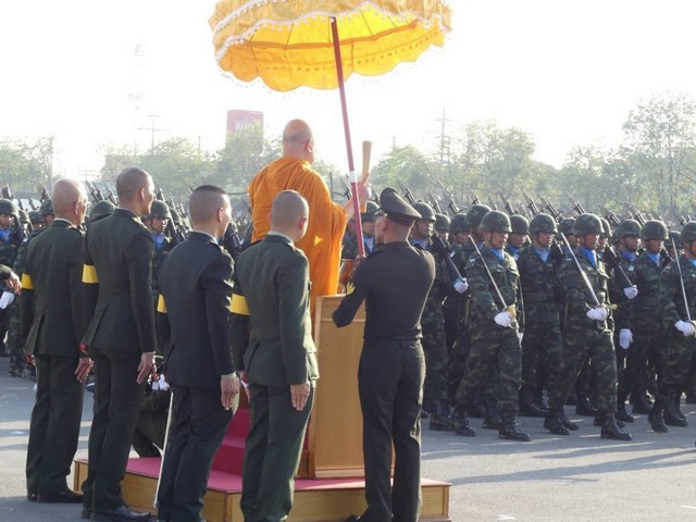 จากนั้นวงดุริยางค์จากกรมดุริยางค์ทหารบกนำแถวนายทหารที่กระทำสัตย์ปฏิญาณตนเข้าสู่สนามพร้อมเชิญธงชัยเฉลิมพลเพื่อทำพิธีเจริญพระพุทธมนต์ได้กราบนิมนต์พระสงฆ์จำนวน 10 รูป จากวัดมงคลชัยพัฒนาพระอารามหลวง วัดพระพุทธบาทราชวรมหาวิหาร วัดสมุหประดิษฐาราม วัดแก่งขนุน วัดท่าพง เจริญพระพุทธมนต์