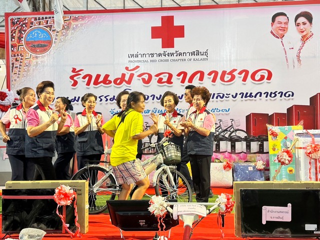 ทั้งนี้ นายสนั่น พงษ์อักษร ผวจ.กาฬสินธุ์ ได้มอบจักรยานให้ผู้โชคดี บริเวณด้านหน้าร้านมัจฉากาชาด ด้วยการยกจักรยานลอยสูงจากพื้น และแสดงความยินดีกับผู้โชคดีที่ได้รับรางวัลและเชิญชวนให้ประชาชนร่วมลุ้นสลากรางวัลในครั้งนี้อีกด้วย ส่วนไฮไลท์ของงานวันนี้ มีผู้โชคดีได้รับรางวัลเป็นจักรยานจำนวน 2 คน ก่อนที่จะรับรางวัลพิธีกรในงานได้ประกาศถึงธรรมเนียมปฏิบัติของผู้ที่โชคดีได้รับรางวัลได้รับทราบว่า ต้องเต้นหรือฟ้อนรำรอบรางวัลที่ตนเองได้รับตามจังหวะดนตรี