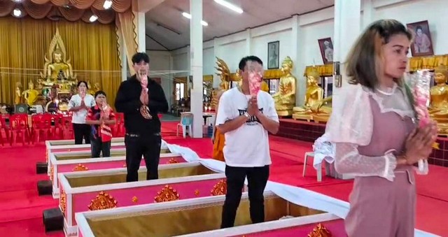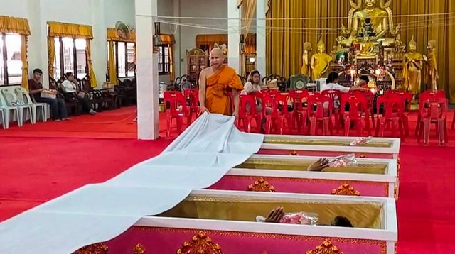 นครนายก – วัดหลวงพ่อปากแดง จัดพิธีนอนโลงศพสะเดาะเคราะห์ต่อชะตา ฝึกตายก่อนตายจริงฝึกสติให้คิดได้ว่าทุกคนหนีไม่พ้นความตาย