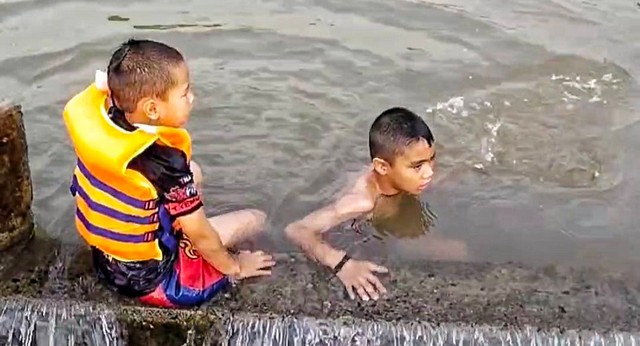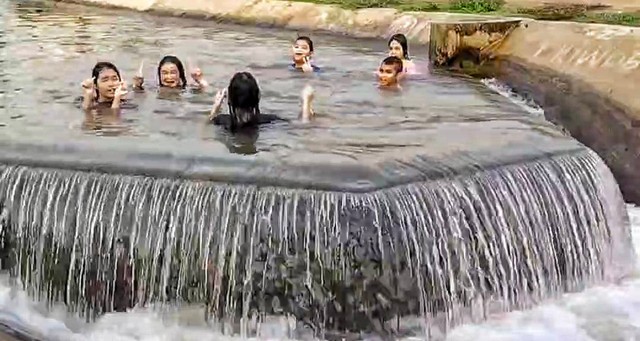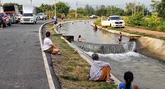 อากาศร้อนชาวบ้านและพื้นที่ใกล้เคียงได้พาลูกหลานมาเล่นน้ำคลายร้อนที่คลองส่งน้ำตำบลศรีนาวา