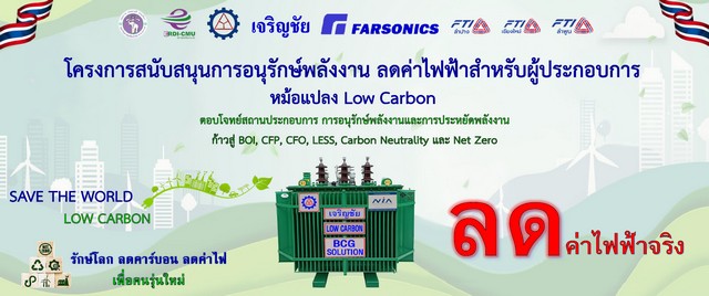 นายประจักษ์ กิตติรัตนวิวัฒน์ กล่าว บริษัท เจริญชัยหม้อแปลงไฟฟ้า จำกัด ขอขอบคุณและแสดงความยินดีกับ บริษัท ฟาร์โซนิคส์ (ประเทศไทย) จำกัด ที่ลดค่าไฟฟ้า 100,000 บาท/เดือน และไว้ใจเลือกติดตั้งหม้อแปลง Low Carbon เป็นหม้อแปลงบริหารระบบจัดการพลังงานที่บริหารจัดการพลังงานสิ้นเปลืองให้เกิดประสิทธิภาพและมีความเสถียรภาพกับการใช้พลังงานไฟฟ้าที่มั่นคงและยั่งยืน ตอบโจทย์โรงงานอุตสาหกรรม, อาคาร สถานประกอบการตามนโยบายด้านพลังงานของรัฐบาลเร่งการลดภาระค่าใช้จ่ายด้านพลังงานให้แก่ประชาชน อันเป็นปัจจัยสำคัญในการดำรงชีวิตและเศรษฐกิจ โดยสนับสนุนการจัดหาแหล่งพลังงานอย่างเหมาะสม ส่งเสริมการผลิตและการใช้พลังงานสะอาดและพลังงานหมุนเวียน เพื่อให้สอดคล้องกับแนวทางการพัฒนาเศรษฐกิจและสิ่งแวดล้อม