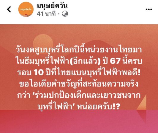 นายสาริษฏ์ สิทธิเสรีชน เจ้าของเฟซบุ๊กเพจ “มนุษย์ควัน” ที่มีผู้ติดตามกว่า 2.6 หมื่นคน ได้โพสต์ข้อความว่าด้วยเรื่องของบุหรี่ไฟฟ้าและวันงดสูบบุหรี่โลกว่า “วันงดสูบบุหรี่โลกปีนี้หน่วยงานไทยมาในธีมบุหรี่ไฟฟ้า(อีกแล้ว) ปี 67 นี้ครบรอบ 10 ปีที่ประเทศไทยแบนบุหรี่ไฟฟ้าพอดี มีใครอยากเสนอคำขวัญที่สะท้อนความจริงกว่า ‘ร่วมปกป้องเด็กและเยาวชนจากบุหรี่ไฟฟ้า’ มั้ยครับ?”