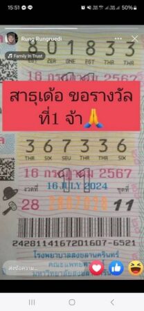 เลยตัดสินใจเลือกมา 2 ใบแต่เป็นท้าย 36 และ33 แบบใบเดี่ยว พอดีพบตัวที่ตนเองชอบ คือ เลขท้าย 36 ประกอบกับใบเลขท้าย 36 เหลือใบเดี่ยว เลข 367336 งวดที่ 28 ชุดที่ 11 งวดวันที่ 16 กรกฎาคม 2567 จึงนำไปโพสลงเฟสบุ๊กว่า สาธุเด้อขอรางวัลที่ 1 จ้า พอถึงเวลาเลขออกผู้ขายโทรมาบอกว่า ถูกรางวัลที่ 1 จึงดีใจสุดขีด เพราะไม่นึกไม่ฝันว่าจะถูกรางวัลที่ 1 หลังจากนั้นจึงแจ้งให้ลูกสาวและญาติทราบทุกต่างมาร่วมแสดงความยินดีนั่งสังสรรค์ตีกลองร้องเพลงกันอย่างสนุกสนาน