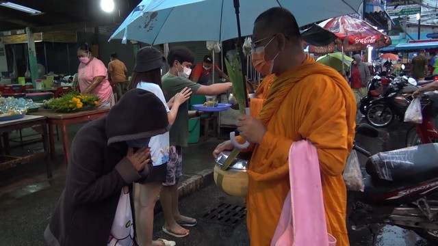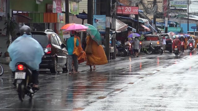 สงขลา-เมืองสงขลาฝนตกต่อเนื่องตั้งแต่กลางดึกเมื่อคืนนี้ต่อเนื่องถึงเช้า ส่งผลกระทบกับพระสงฆ์ต้องเดินกางร่มออกรับบิณฑบาตจากประชาชนท่ามกลางสายฝน ในช่วงเช้า ทำให้สบงจีวรเปียกปอน ในขณะเดียวกัน ศูนย์อุตุนิยมวิทยาภาคใต้ฝั่งตะวันออก รายงานสภาพวันนี้ ร่องมรสุมพาดผ่านภาคกลางตอนล่าง ภาคใต้ตอนบน บริเวณภาคใต้ฝั่งตะวันออกมีฝนเพิ่มขึ้น โดยมีฝนฟ้าคะนองและมีฝนหนักหลายพื้นที่