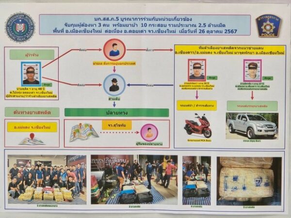 เมื่อวันที่ 26 ตุลาคม 2567 เวลาประมาณ 22.15 น. เจ้าหน้าที่ตำรวจ กก.สส.2 บก.สส.ภ.5 บูรณาการร่วมกับหน่วยงานที่เกี่ยวข้อง ทำการจับกุมผู้ต้องหา จำนวน 3 คน คือนายอัครชัย อายุ 27 ปี ภูมิลำเนา อ.เชียงดาว จว.เชียงใหม่, นายภูมิพัฒน์ อายุ 30 ปี ภูมิลำเนา อ.แม่แตง จว.เชียงใหม่ และนายดุสิต อายุ 48 ปี ภูมิลำเนา อ.ดอยเต่า จว.เชียงใหม่พร้อมด้วยของกลาง ยาบ้าจำนวน 10 กระสอบ รวมประมาณ 2.5 ล้านเม็ด ที่บริเวณสถานีบริการน้ำมัน ตั้งอยู่ที่ถนนเชียงใหม่ – หางดง หมู่ 6 ต.แม่เหียะ อ.เมืองเชียงใหม่ จว.เชียงใหม่ ต่อเนื่อง สวนลำไย พื้นที่หมู่ 6 ต.โปงทุ่ง อ.ดอยเต่า จว.เชียงใหม่