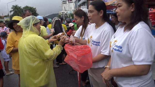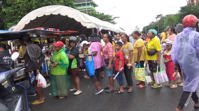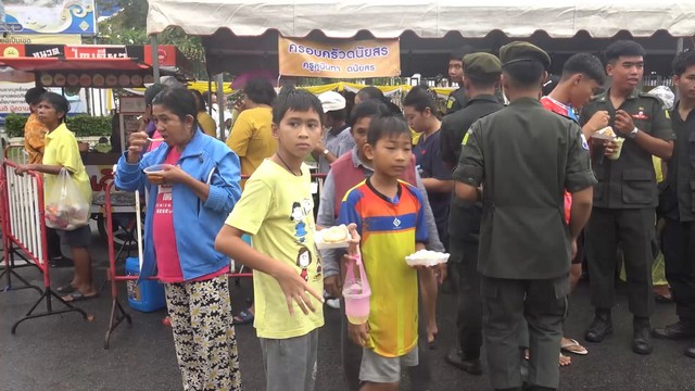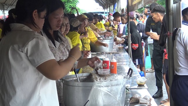 โดยบริการอาหารฟรีตลอดทั้งวันให้กับประชาชน นำอาหารหลากหลายเมนู รวมทั้งน้ำผลไม้ น้ำดื่ม มาบริการให้กับประชาชนกินฟรี มีประชาชนจำนวนมาก เดินทางมารับอาหารและเครื่องดื่ม ชนิดที่เรียกว่า “เดินไปกินไป” กินหมดแวะเข้ามากินต่อได้ตลอดเวลา อยากกินอะไรเข้ามาหยิบไปกินได้เลย ในส่วนการปรุงอาหารก็มีการจัดพ่อครัวแม่ครัวมาปรุงอาหารกันสดๆในเต็นท์ เพื่อรองรับประชาชนที่มาใช้บริการเป็นจำนวนมากอย่างต่อเนื่องไม่ขาดสาย แม้ว่าในวันนี้มีฝนตกลงมาเป็นช่วงๆก็ตาม