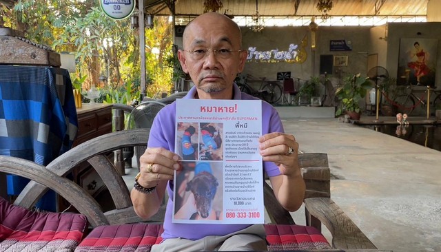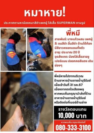 วันที่ 7 ม.ค 68 ผู้สื่อข่าวรายงานว่า นายธนวิน กฤตสิน อายุ 62 ปี เจ้าของร้านอาหารบ้านชายน้ำบุรีรัมย์ ในอำเภอเมือง จังหวัดบุรีรัมย์ ได้ออกประกาศตามหาสุนัขเพศผู้ชื่อ “พี่หมี” อายุประมาณ 20 ปี สายพันธุ์บางแก้วผสม ที่หายออกจากร้านตั้งแต่เช้าวันที่ 31 ธันวาคม 2567 เนื่องจากตกใจเสียงพลุในช่วงเทศกาลปีใหม่