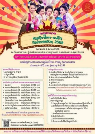ชมการประกวดหนูน้อยไทย-รามัญ วัดกลางสวน ประจำปี 2568 วันอาทิตย์ที่ 2 มีนาคม 2568 ณ วัดกลางสวน ถ.ปู่เจ้าสมิงพราย ต.บางหญ้าแพรก อ.พระประแดง จ.สมุทรปราการ ชิงมงกุฎ-สายสะพาย-ถ้วยรางวัลเกียรติยศ รางวัลเงินสด และของรางวัลอีกมากมาย
