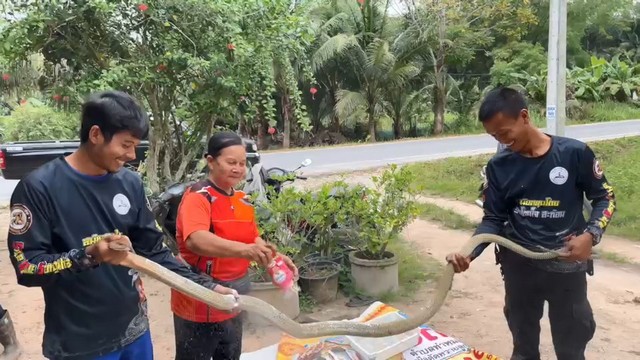 โดยบอกว่าเป็น งูเจ้าที่ เจ้าหน้าที่จึงทำการจับเห็บให้งู ก่อนใส่กระสอบเตรียมนำไปปล่อยคืนสู่ป่าธรรมชาติที่อยู่ห่างไกลบ้านเรือนผู้คนต่อไป