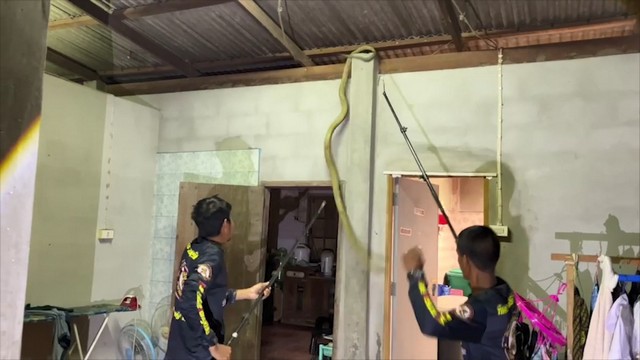 จงอางยักษ์สีเหลืองทองโผล่บนหลังคาบ้าน เชื่อมาให้โชคช่วงใกล้ตรุษจีน เจ้าบ้านรีบโรยแป้งหอมให้ จงอางก่อนปล่อย บอกงูเจ้าที่