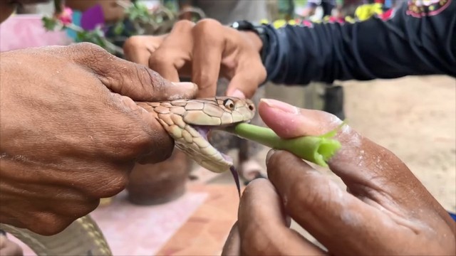 นายทวีศักดิ์ บุญเศษ เจ้าหน้าที่เครือข่ายทีมอสรพิษวิทยาภาคใต้ ได้รับแจ้งจากนางหนูเจียร ทองเอียด อายุ 68 ปี อยู่บ้านเลขที่ 96/1 ม.4 ต.ท่าหมอไทร อ.จะนะ จ.สงขลา ว่ามีงูจงอาง มาอยู่บนหลังคาบ้านในห้องครัว ขอให้มาช่วยจับด้วยหลังจากนายทวีศักดิ์ ฯ ได้รับแจ้งจึงพร้อมด้วย นายอภิชาติ พรหมสงค์