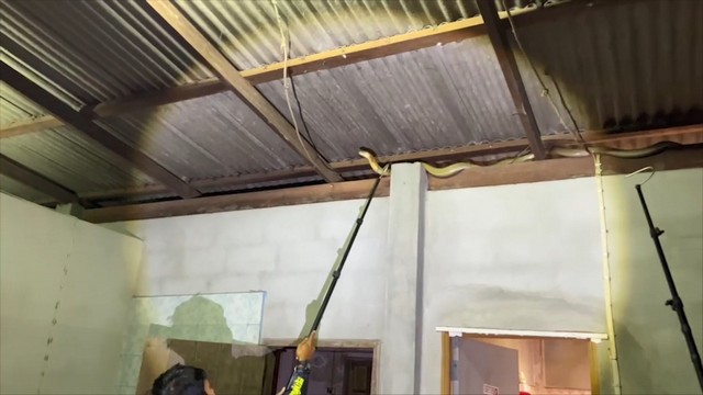 จงอางยักษ์สีเหลืองทองโผล่บนหลังคาบ้าน เชื่อมาให้โชคช่วงใกล้ตรุษจีน เจ้าบ้านรีบโรยแป้งหอมให้ จงอางก่อนปล่อย บอกงูเจ้าที่