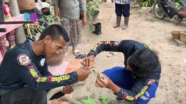 นายทวีศักดิ์ บุญเศษ เจ้าหน้าที่เครือข่ายทีมอสรพิษวิทยาภาคใต้ ได้รับแจ้งจากนางหนูเจียร ทองเอียด อายุ 68 ปี อยู่บ้านเลขที่ 96/1 ม.4 ต.ท่าหมอไทร อ.จะนะ จ.สงขลา ว่ามีงูจงอาง มาอยู่บนหลังคาบ้านในห้องครัว ขอให้มาช่วยจับด้วยหลังจากนายทวีศักดิ์ ฯ ได้รับแจ้งจึงพร้อมด้วย นายอภิชาติ พรหมสงค์
