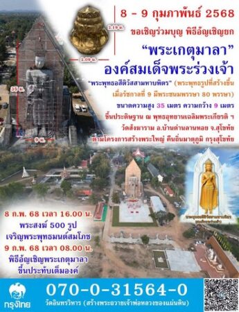 ขอเชิญร่วมบุญใหญ่ ครั้งประวัติศาสตร์ ร่วมพิธีอัญเชิญ “พระเกตุมาลา” ประทับ “พระเศียร” องค์สมเด็จพระร่วงเจ้า สูง 35 เมตร แทนคุณของแผ่นดิน ถวายเป็นพุทธบูชา ธรรมะบูชา สังฆบูชา น้อมระลึกอุทิศถวายเป็นพระราชกุศล แด่พระบาทสมเด็จพระบรมชนกาธิเบศวร มหาภูมิพลอดุลยเดช มหาราชบรมนาถบพิตร