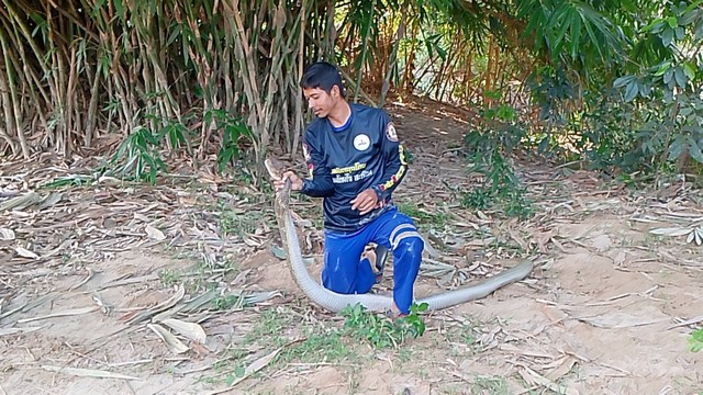 แต่ เจ้าหน้าที่ก็สามารถใช้มือเปล่าจับหัวงูจงอางยักษ์เอาไว้ได้ โดยใช้เวลานานประมาณ 5 นาที ก็สามารถจับงูจงอางเอาไว้ได้นำมาวัดได้ความยาวถึง 4.20 เมตร รีบนำใส่กระสอบเตรียมนำไปปล่อยคืนสู่ป่าธรรมชาติที่อยู่ห่างไกลบ้านเรือนผู้คนต่อไป