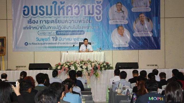 วันนี้ (19 มีนาคม 2568) เวลา 09.30 น. นายกองตรี ดร.ธนกฤต จิตรอารีรัตน์ ผู้ช่วยรัฐมนตรีประจำกระทรวงสาธารณสุข เป็นประธานเปิดโครงการอบรมให้ความรู้เรื่องการเตรียมความพร้อมและแนวทางการป้องกันความปลอดภัยแก่เจ้าหน้าที่ในการปฏิบัติงานในโรงพยาบาล เขตสุขภาพที่ 7 ประจำปีงบประมาณ 2568 โดยมี นายแพทย์เอกชัย เพียรศรีวัชรา ผู้ตรวจราชการกระทรวงสาธารณสุข เขตสุขภาพที่ 7, นายชัชวาลย์ เบญจสิริวงศ์ ผู้ว่าราชการจังหวัดร้อยเอ็ด, นายแพทย์สุรเดชช ชวะเดช นายแพทย์สาธารณสุขจังหวัดร้อยเอ็ด พร้อมด้วยผู้บริหารและเจ้าหน้าที่ในสังกัดกระทรวงสาธารณสุข เข้าร่วม ที่ ศูนย์ประชุมสาเกตฮอลล์ อำเภอเมืองร้อยเอ็ด จังหวัดร้อยเอ็ด