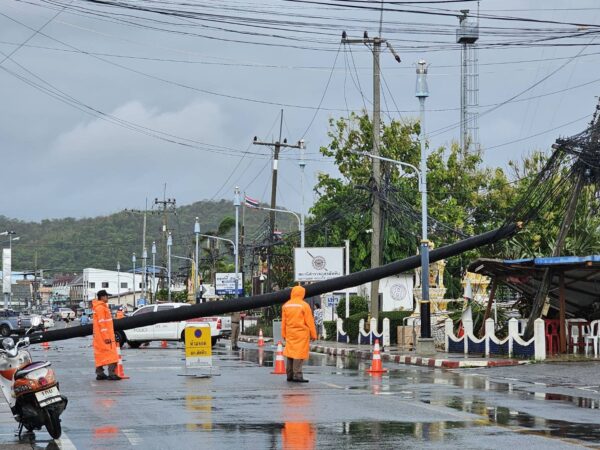 สัตหีบ ฝนตกลมแรงต้นตาล หักโค่นล้มพาดสายไฟ และร้านค้าหน้าโรงพักพังเสียหายไฟดับนับชั่วโมง โชคดีไม่มีใครเจ็บ