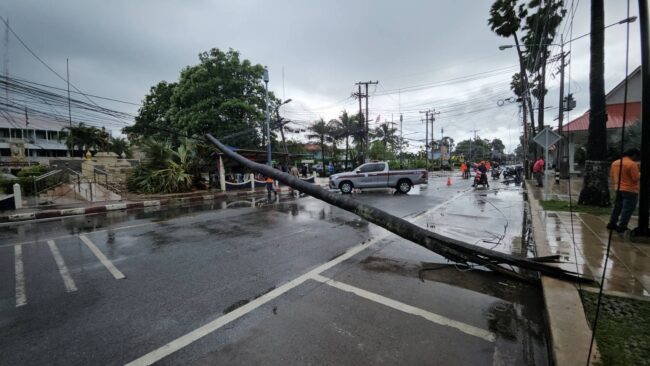สัตหีบ ฝนตกลมแรงต้นตาล หักโค่นล้มพาดสายไฟ และร้านค้าหน้าโรงพักพังเสียหายไฟดับนับชั่วโมง โชคดีไม่มีใครเจ็บ