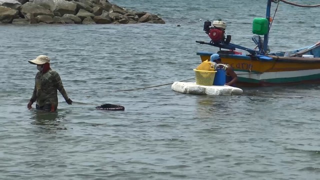 นายดลเหล๊าะหมาน หมัดเส็น วัย 45 ปี ชาวประมงอวนปูชุมชนบ้านบ่ออิฐ ต.เกาะแต้ว อ.เมือง จ.สงขลา บอกว่า วันนี้ได้นำเรือออกไปวางอวนปูม้า ตั้งแต่ประมาณตีสาม โดยวิ่งเรือออกไปประมาณเกือบชั่วโมงจากฝั่ง ระยะทางประมาณ 5- 6 กิโลเมตร เพื่อไปวางอวนปู หลังจากนั้นก็จะกลับเข้าฝั่งในช่วงเช้า วันนี้ได้ปูม้าประมาณ 5 – 6 กิโลกรัม ทั้งตัวใหญ่และตัวเล็ก ทั้งตัวผู้ตัวเมีย โดยทำการแกะปูม้าออกจากอวนบนเรือและใส่ในท้องเรือที่ใส่น้ำเตรียมไว้ เพื่อไม่ให้ปูตาย เมื่อถึงฝั่งก็นำไปใส่ถุงตาข่ายไปแช่น้ำในทะเล เพื่อให้ปูอยู่ในน้ำและยังมีชีวิต เพราะปูม้าจะต้องขายปูเป็นๆ จึงจะได้ราคาดี