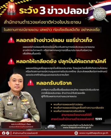 สำนักงานตำรวจแห่งชาติเตือน ระวังผู้ไม่หวังดี ฉวยโอกาสใช้ข่าวปลอม ปลุกปั่นคนไทย และหลอกรับบริจาค