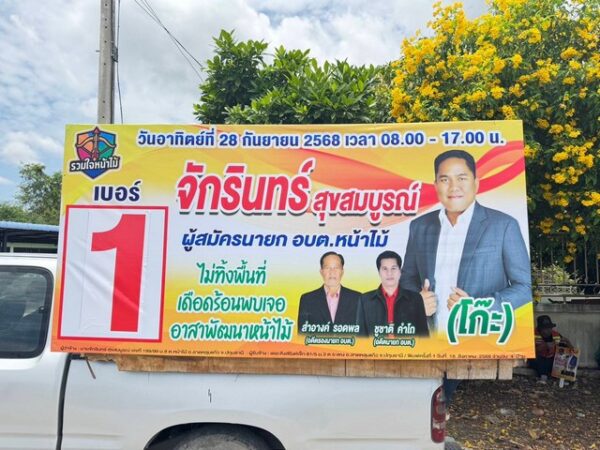 เมื่อวันที่ 18 สิงหาคม 2568 เวลา 9.00 น.ผู้สื่อข่าวรายงานจากองค์การบริหารส่วนตำบลหน้าไม้ อำเภอลาดหลุมแก้ว จังหวัดปทุมธานี เนื่องจากองค์การบริหารส่วนตำบลหน้าไม้ได้เปิดรับสมัครนายกองค์การบริหารส่วนตำบลหน้าไม้ที่ว่างลงเนื่องจากคนเก่าได้ลาออกจากการเป็นนายกฯจึงทำให้ตำแหน่งนายกว่างลง วันนี้จึงเปิดรับสมัครนายกองค์การบริหารส่วนตำบลหน้าไม้วันแรก มีการเปิดตัวว่าที่ผู้สมัครนายกองค์การบริหารส่วนตำบลหน้าไม้ืคนใหม่ เบอร์ 1 นายจักรินทร์ สุขสมบูรณ์ พร้อมทีมงาน “รวมใจหน้าไม้” ประสานงานต่อก่องานใหม่ พัฒนาตำบลหน้าไม้ให้มีความเจริญอย่างต่อเนื่อง