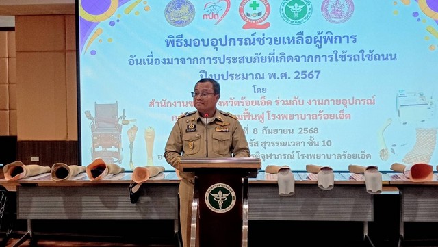 วันนี้ ( 8 กันยายน 2568 ) เวลา 11.00 น. ณ โรงพยาบาลร้อยเอ็ด อำเภอเมืองร้อยเอ็ด จังหวัดร้อยเอ็ด นายชัชวาลย์ เบญจสิริวงศ์ ผู้ว่าราชการจังหวัดร้อยเอ็ด เป็นประธานในพิธีมอบอุปกรณ์ช่วยเหลือผู้พิการจากอุบัติเหตุทางถนน โดยมีขนส่งจังหวัดร้อยเอ็ด โรงพยาบาลร้อยเอ็ด พร้อมด้วยหัวหน้าส่วนราชการ คณะแพทย์ พยาบาล และผู้พิการ เข้าร่วม