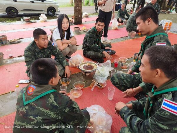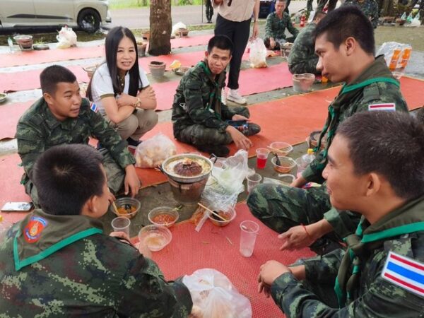 น.ส.ธนชนก สุริยเดชสกุล ผู้แทนคณะนักศึกษาหลักสูตรคณะสัมพันธ์ ระดับผู้บริหาร กองทัพภาคที่ 2 รุ่นที่ 2 (พสบ.ทภ.2 รุ่นที่ 2) พร้อมด้วย นายพัฒน์เกียรติขจร สายแวว ผู้จัดการคันทรี่เฮ้าส์เชียงใหม่ นายอรรครัตน์ รัตนจันทร์ นายกสมาคมสื่อสารมวลชนไทยอินโดจีน และคณะส่วนราชการ รวมถึงองค์กรปกครองส่วนท้องถิ่นจังหวัดอุบลราชธานี ได้นำ “หมูกระทะ 100 เตา” พร้อมขนมและเครื่องดื่ม มาจัดเลี้ยงแก่กำลังพลกว่า 300 นาย ที่ปฏิบัติหน้าที่ปกป้องอธิปไตยแนวชายแดนไทย–กัมพูชา