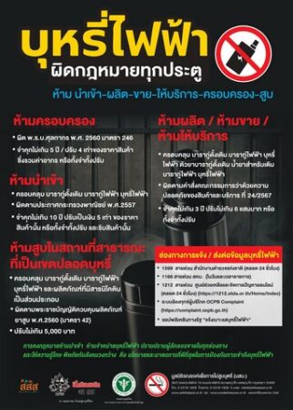 “บุหรี่ไฟฟ้า” ไม่เพียงแต่เป็นอันตรายต่อสุขภาพ แต่ยังเป็นสิ่งผิดกฎหมายอีกด้วย ซึ่งการมีบุหรี่ไฟฟ้าไว้ในครอบครองไม่ว่าจะมีไว้เพื่อเสพ หรือมีไว้เพื่อจำหน่าย ล้วนมีความผิดตามกฎหมายจะต้องถูกดำเนินคดี ทั้งจำทั้งปรับ ดังนี้.-