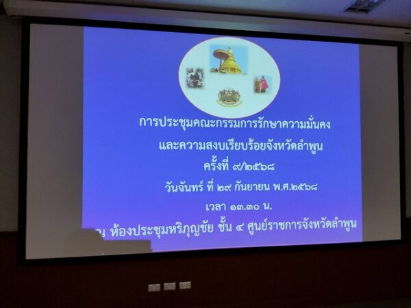 นายโยธิน ประสงค์ความดี รองผู้ว่าราชการจังหวัดลำพูน เป็นประธานการประชุมคณะกรรมการรักษาความมั่นคงและความสงบเรียบร้อยจังหวัดลำพูน ครั้งที่ 9/2568 โดยมีคณะกรรมการฯ เจ้าหน้าที่ และหน่วยงานที่เกี่ยวข้องเข้าร่วมฯ เมื่อวันที่ 29 กันยายน 2568 เวลา 13 นาฬิกา 30 นาที ที่ห้องประชุมหริภุญชัย ชั้น 4 ศาลากลางจังหวัดลำพูน