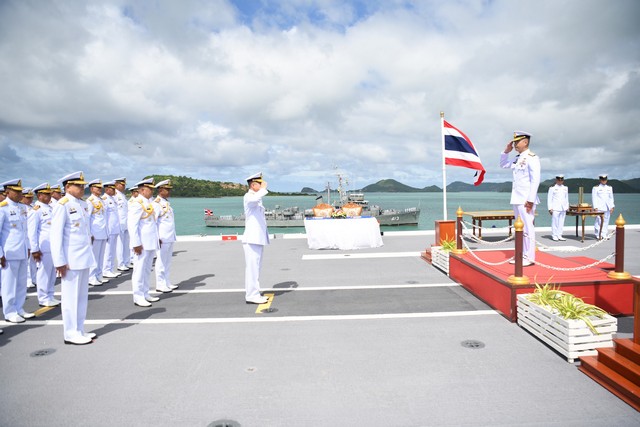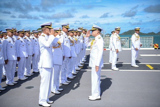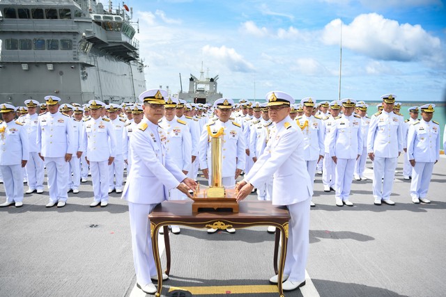 เรือหลวงปิ่นเกล้า ยิงสลุตครั้งสุดท้าย ในพิธีรับ-ส่งหน้าที่ ผบ.กองเรือยุทธการ ก่อนปลดระวางประจำการ 1 ต.ค.นี้