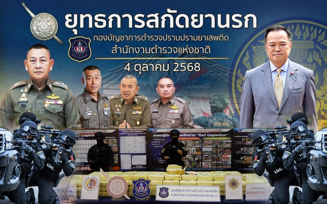 เมื่อวันที่ 4 ตุลาคม 2568 ที่กองบัญชาการตำรวจปราบปรามยาเสพติด (บช.ปส.) – นายอนุทิน ชาญวีรกูล นายกรัฐมนตรีและรัฐมนตรีว่าการกระทรวงมหาดไทย เป็นประธานการแถลงผลการปฏิบัติงานด้านการปราบปรามยาเสพติด ณ บช.ปส. โดยมี พล.ต.ท.รุทธพล เนาวรัตน์ รัฐมนตรีว่าการกระทรวงยุติธรรม, พล.ต.อ.กิตติ์รัฐ พันธุ์เพ็ชร์ ผบ.ตร., พ.ต.ต.สุริยา สิงหกมล เลขาธิการ ป.ป.ส., พล.ต.อ.สำราญ นวลมา รอง ผบ.ตร., พล.ต.ท.สมประสงค์ เย็นท้วม ผู้ช่วย ผบ.ตร., พล.ต.ท.อาชยน ไกรทอง ผบช.ปส., พล.ต.ท.สยาม บุญสม ผบช.น., พล.ต.ท.รุ่งโรจน์ ฐากูรปุณยสิริ ผบช.ตชด., พลโท ณัฐศิษฐ์ คงชินศาสตร์ธิต ผอ.ศปป.2 กอ.รมน., พ.อ.เกียรติศักดิ์ ทรัพย์เมฆ รอง ผบ.ขกท. และผู้บังคับบัญชา เข้าร่วมอย่างพร้อมเพรียง เพื่อตอกย้ำความมุ่งมั่นของรัฐบาลในการ “ต้องชนะยาเสพติด” ให้ได้อย่างเด็ดขาด