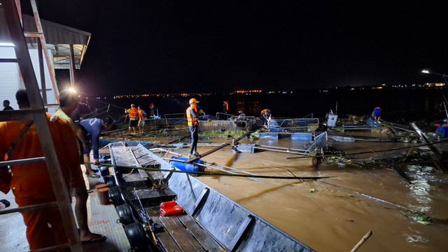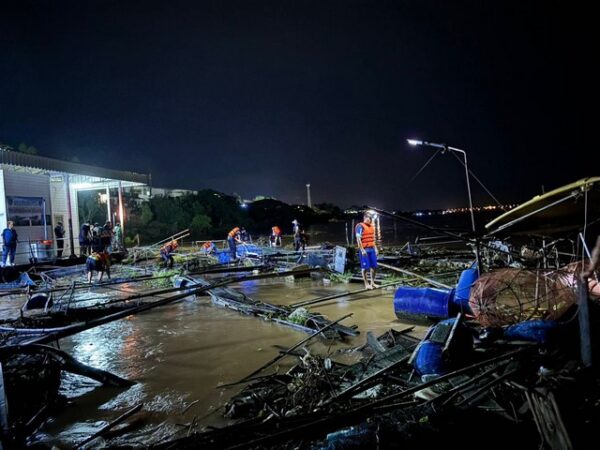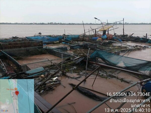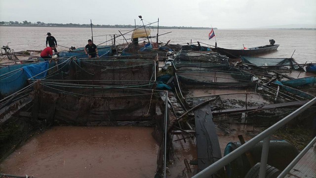 มุกดาหาร -พายุซัดกระชังปลาน้ำโขงขาด! ลอยชนแพเรือตำรวจน้ำมุกดาหาร เจ้าหน้าที่เร่งรื้อถอนฝ่ากระแสน้ำเชี่ยว