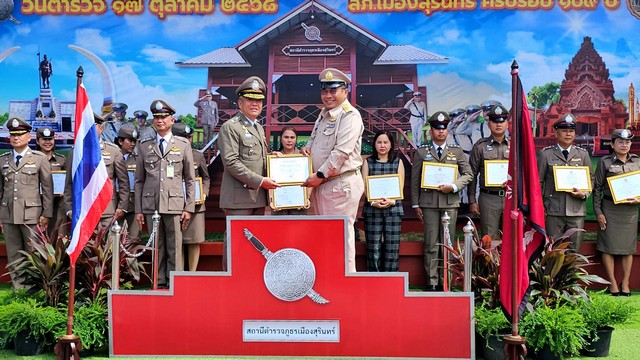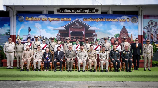 วันที่ 17 ตุลาคม 2568 เวลา 09.30 น. พลตรี ไชยนคร กิจคณะ ผู้บัญชาการมณฑลทหารบกที่ 25 มอบหมายให้ พันเอก อัครสิทธิ์ ปะกิระตา รองผู้บัญชาการมณฑลทหารบกที่ 25(1)/รองผู้อำนวยการกองอำนวยการรักษาความมั่นคงภายในจังหวัดสุรินทร์(ท.) ร่วมกิจกรรม “วันตำรวจ” ปี 2568 โดยมี พลตำรวจตรี สุคนธ์ ศรีอรุณ ผู้บังคับการตำรวจภูธรจังหวัดสุรินทร์ นำเจ้าหน้าที่ตำรวจให้การต้อนรับ มี นายประภาส ศรีจันทร์เวียง รองผู้ว่าราชการจังหวัดสุรินทร์ ร่วมเป็นเกียรติ และ หัวหน้าส่วนราชการที่เกี่ยวข้อง ร่วมกิจกรรม พันตำรวจโท อรรถพล ยางนอก รองผู้กำกับการจราจร สถานีตำรวจภูธรเมืองสุรินทร์ นำข้าราชการตำรวจ 150 นาย กล่าวปฎิญาณตน พันตำรวจเอก เอกพงษ์ พลมณี ผู้กำกับการสถานีตำรวจภูธรเมืองสุรินทร์ กล่าวรายงาน ในนามของข้าราชการตำรวจภูธรจังหวัดสุรินทร์ ตำรวจ คือ ผู้มีหน้าที่รักษาความยุติธรรมเบื้องต้น คอยป้องกันเหตุ ดูแลความปลอดภัยในชีวิตและทรัพย์สินของประชาชน