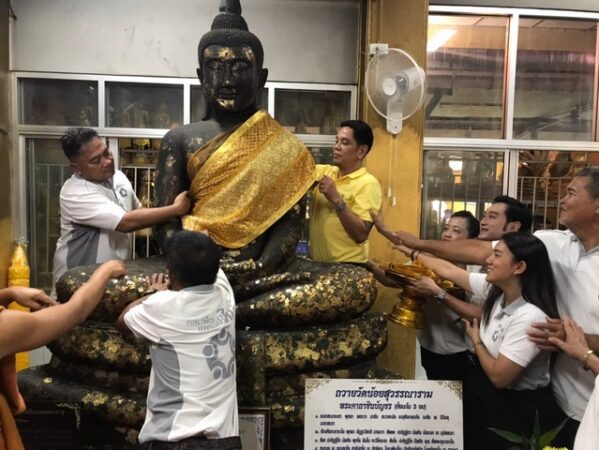 ทั้งนี้ นายอำนวย บุญริ้ว นายกเทศมนตรีเมืองแพรกษาใหม่ ได้นำคณะผู้บริหาร สมาชิกสภาเทศบาล ร่วมกันนำผ้าแพรห่มองค์พระพุทธภายในวิหารเพื่อความเป็นสิริมงคล อีกทั้งยังได้นำไก่ย่างนำมาออกร้านตั้งโรงทานแจกจ่ายให้กับประชาชนที่มาร่วมงาน