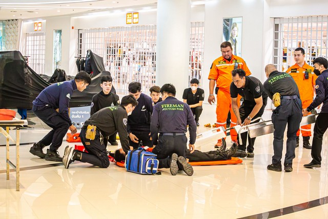 ปทุมธานี จำลองเหตุเพลิงไหม้กลางห้าง ฟิวเจอร์พาร์คซ้อมอพยพหนีไฟรับมือเหตุฉุกเฉิน