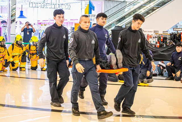 โดยมีการสาธิตขั้นตอนดับเพลิงเบื้องต้น การช่วยเหลือผู้ประสบเหตุ และการอพยพหนีไฟอย่างเป็นระบบ ได้รับคำแนะนำจากเจ้าหน้าที่ผู้เชี่ยวชาญด้านอัคคีภัย พร้อมทั้งพนักงานจากร้านค้าในศูนย์ฯ อาทิ ห้างสรรพสินค้าโรบินสัน เซ็นทรัล บิ๊กซี โฮมโปร โรงภาพยนตร์เมเจอร์ และร้านค้าต่าง ๆ เข้าร่วมอย่างพร้อมเพรียง