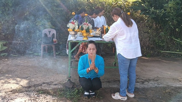 ขณะเดียวกันได้มีการทำพิธีจุดธูปขอขมาแก้บนด้วยอาหารหวานคาวผลไม้ 9 อย่าง นั้นเพื่อนของ เจ๊จ่อย คนนึงมีอาการร้องไห้ขึ้นมาอย่างแรง โดยเพื่อนๆได้บอกว่าเขามาทำบุญไม่เป็นไรเขามาเอาบุญจากนั้นจึงมีอาการสงบลงแล้วกลับมาพูดอย่างปกติ โดยเจ๊จ่อย จึงได้นำธูปตัวเลขเสี่ยงโชคมาจุด เพื่อขอโชคพอธูปไหม้หมดเพื่อนๆและคอหวยไม่พลาดส่องเลขธูป เห็นเป็นตัวอย่างชัด412 เพื่อนๆจึงพากันเอาโทรศัพท์มือถือถ่ายรูปเลขที่เห็นเพื่อเสี่ยงดวงงวด วันที่1 พฤศจิกายน 68 นี้
