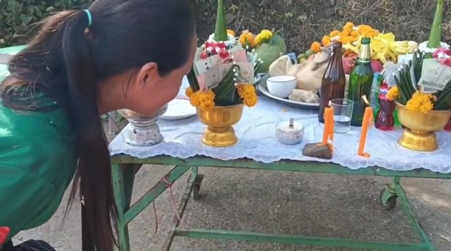 จากการสอบถาม นางรินณา หล้าสุดธิ์ หรือเจ๊จ่อย เล่าว่าตนเองได้มาทำบุญที่วัดแห่งนี้เป็นอยู่ประจำ ก็เลยขอโชคขอลาภจากเจ้าที่เจ้าทางวัดแห่งนี้ วันนี้ได้นำอาหารหวานคาวคนละหมากรากไม้ 9 อย่างมาแก้บนหลายงวดที่ผ่านมาถูกหวยมาตลอดได้เงินเกือบล้าน 9 แสนกว่าบาทจึงมาแก้บนในวันนี้ พร้อมนำตัวเลขไปเสี่ยงโชคต่อ