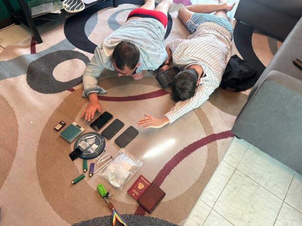 เมื่อเจ้าหน้าที่ตำรวจชุดจับกุมเดินทางไปถึงบ้านหลังดังกล่าว พบว่าประตูหน้าบ้านเปิดอยู่ และเห็นชายชาวต่างชาติ 2 คน กำลังนั่งล้อมโต๊ะลักษณะก้ม ๆ เงย ๆ เมื่อเจ้าหน้าที่แสดงตัวเป็นตำรวจท่องเที่ยว ชายทั้งสองคนได้ลุกขึ้นอย่างรวดเร็ว พร้อมกับหยิบผ้าคลุมสิ่งของลักษณะเป็นผงสีขาวบนโต๊ะ และพยายามวิ่งหนีเข้าไปในห้องนอน เจ้าหน้าที่จึงได้ติดตามและควบคุมตัวไว้ได้ทันที