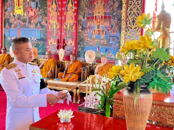 โดยมี พ.ต.อ.ไพโรจน์ เพ็ชรพลอย ผกก.สภ.บางพลี จุดเทียนบูชาพระรัตนตรัย พร้อมด้วย นายแพทย์เสาร์ ปัญจพงษ์ ผอ.โรงพยาบาลบางพลี จุดเครื่องทองน้อยหน้าพระบรมฉายาลักษณ์สมเด็จพระนางเจ้าสิริกิติ์ พระบรมราชินีนาถ พระบรมราชชนนีพันปีหลวง