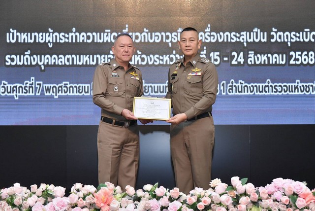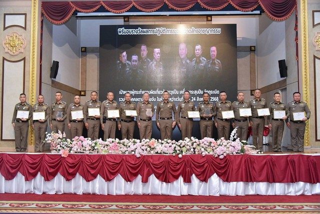 จากนั้น ผบ.ตร. มอบรางวัลให้แก่หน่วยงานที่มีผลการปฏิบัติดีเด่น และดี ด้านการจับกุมผู้กระทำความผิดเกี่ยวกับอาวุธปืน เครื่องกระสุนปืน และสืบสวนจับกุมบุคคลตามหมายจับ จากการระดมกวาดล้างอาชญากรรม ห้วงวันที่ 15 – 24 สิงหาคม 2568 ภายใต้แผนยุทธการ “พิชิตคนพาล อภิบาลคนดี” ซึ่งสำเร็จลุล่วงไปด้วยดี มีผลการปฏิบัติเป็นที่ประจักษ์ เพื่อเป็นขวัญกำลังใจให้แก่หน่วยงานและข้าราชการตำรวจที่ปฏิบัติหน้าที่อย่างเต็มกำลังความสามารถ