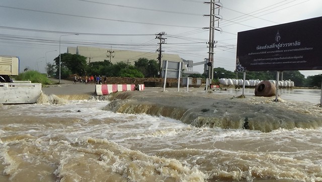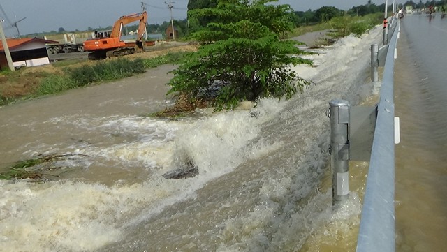 ส่วนที่ถนนสาย 3501 (อ่างทอง-ป่าโมก สายใน)บริเวณตำบลนรสิงห์ อำเภอป่าโมก จังหวัดอ่างทอง กระแสน้ำจากแม่น้ำเจ้าพระยา ได้เอ่อล้นไหลผ่านข้ามถนนลงคลองชลประทาน เจ้าหน้าที่กำลังปั้นคันดินกั้นน้ำไหลบ่าผ่านถนน โดยมีเจ้าหน้าที่ตำรวจปิดกั้นการจราจรถนนสาย 3501 (อ่างทอง-ป่าโมก สายใน) บริเวณสะพานนรสิงห์