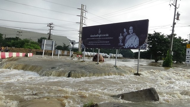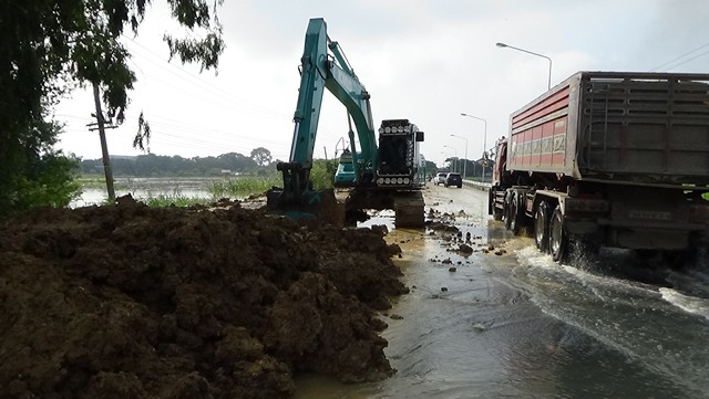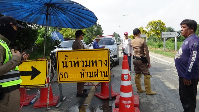 ส่วนที่ถนนสาย 3501 (อ่างทอง-ป่าโมก สายใน)บริเวณตำบลนรสิงห์ อำเภอป่าโมก จังหวัดอ่างทอง กระแสน้ำจากแม่น้ำเจ้าพระยา ได้เอ่อล้นไหลผ่านข้ามถนนลงคลองชลประทาน เจ้าหน้าที่กำลังปั้นคันดินกั้นน้ำไหลบ่าผ่านถนน โดยมีเจ้าหน้าที่ตำรวจปิดกั้นการจราจรถนนสาย 3501 (อ่างทอง-ป่าโมก สายใน) บริเวณสะพานนรสิงห์