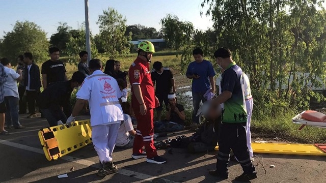 ที่เกิดเหตุเป็นถนนทางโค้งฝั่งขาเข้าตัวจังหวัดร้อยเอ็ด พบเสาไฟส่องสว่างข้างทางหักไป 1 ต้น และพบกับรถบัสรับส่งพนักงานของบริษัทเจริญผลเดินรถสีขาว ในสภาพพลิกคว่ำล้อชี้ฟ้าอยู่กลางทุ่งนา ห่างจากถนนประมาณ 50 เมตร เจ้าหน้าที่จึงช่วยกันลำเลียงผู้บาดเจ็บซึ่งมีทั้งชายและหญิงกว่า 20 ราย ขึ้นมาจากรถและลำเรียงส่งรักษาตัวยังโรงพยาบาลอำเภอธวัชบุรี และโรงพยาบาลอำเภอเสลภูมิ โดยมีผู้ได้รับบาดเจ็บที่อาการสาหัสประมาณ 6 ราย